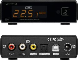 The E30 is one up from the D10 and comes with three inputs and six digital filters, an unusual find at this price point. The USB input handles PCM signals from 44.1 to 768kHz and up to 32bit. It can also decode native DSD from DSD64 to 512 and DoP up to DSD256. The optical and coaxial inputs are 44.1 to 192kHz and up to 24bit.